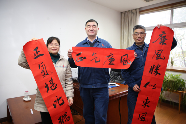 寧柏偉給該公司總經(jīng)部、財務(wù)部、燃運部、思政部、前期辦以及法律(風(fēng)控)事務(wù)部等部門贈送了廉潔春聯(lián)。每到一處,寧柏偉親自將春聯(lián)送到各部門負(fù)責(zé)人手中,并合影留念表達(dá)新年祝福。他談到,此次送廉政春聯(lián)活動,該公司紀(jì)委首次將范圍擴大到全體部門,通過開展為部門送廉政春聯(lián)活動,寓教于樂,宣傳廉政紀(jì)律,提醒領(lǐng)導(dǎo)干部員工時刻繃緊廉潔自律線,清廉、祥和過春節(jié);同時將廉政文化元素融入春聯(lián)之中,展示了中國傳統(tǒng)文化,以喜慶的形式弘揚清風(fēng)正氣,傳遞廉潔正能量。
