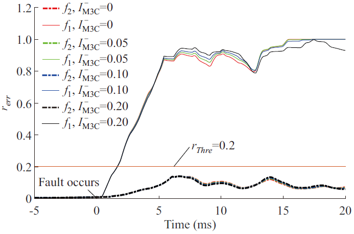 縱聯(lián)電流差動保護憑借其優(yōu)異性能成為新能源送出高壓交流線路主保護。在同步機系統(tǒng)中,故障線路兩側電流基本同相,縱聯(lián)電流差動保護具有很高的靈敏度。新能源場站接入強電網場景下,即便新能源側與電網側故障電流相位差異較大,但因二者提供故障電流幅值的能力有顯著區(qū)別,當幅值差大于特定值時,使得任何電流相位差下縱聯(lián)電流差動保護都能正常工作。相較于前兩個場景,在低頻輸電系統(tǒng)中,縱聯(lián)電流差動保護的靈敏度與GSC和M3C提供的負序電流密切相關。兩者注入的負序電流越低,靈敏度越低,從而引起保護誤動作。單相接地故障及兩相相間故障下,當GSC和M3C均抑制其輸出負序電流時,故障支路電流在穩(wěn)態(tài)時理論值降為0,因此僅基于電流的穩(wěn)態(tài)量保護將在原理上失效。