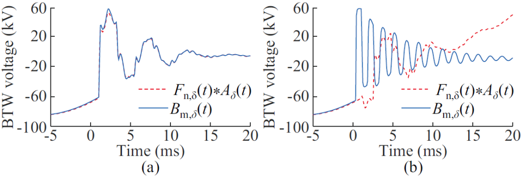 圖3 經本端與對端模量信息計算的電壓反行波對比 (a) 區(qū)外故障 (b) 區(qū)內故障