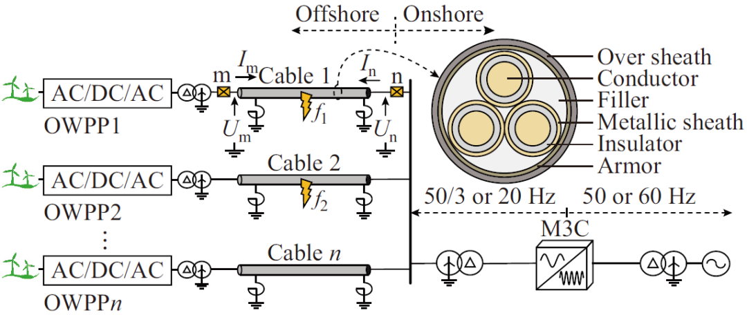 圖1給出了海上風電低頻輸電系統(tǒng)拓撲,海纜需匯集來自于風電場的電能,并經模塊化多電平矩陣換流器(modular multilevel matrix converter,M3C)實現(xiàn)頻率轉換,從而在M3C低頻側構成了100%電力電子源場景。相較于同步機系統(tǒng)在負序網絡中源側只體現(xiàn)阻抗特性,低頻輸電系統(tǒng)負序網絡中線路兩側均可體現(xiàn)為電源特性。根據單相接地故障和兩相相間故障復合序網圖,故障支路電流可由負序電流唯一確定,當M3C和海上風電場網側變流器(grid-side converter, GSC)抑制負序電流時,盡管故障點處存在負序電壓源,但兩側換流器均會生成幅值相位相同的電壓源,以抵消系統(tǒng)中的負序電流,因此系統(tǒng)故障電流仍保持對稱,使得故障支路的穩(wěn)態(tài)電流為0。上述分析表明,雖然風電場升壓變壓器和M3C低頻側隔離變壓器網側中性點均采取直接接地方式,但低頻輸電系統(tǒng)在特定故障控制策略下呈現(xiàn)出類似于中性點非直接接地系統(tǒng)的故障特征。