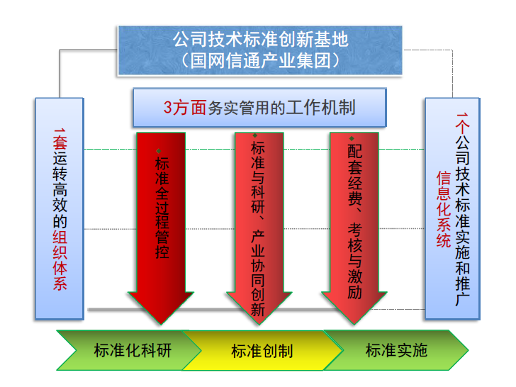 該創(chuàng)新基地基于2019籌建工作基礎(chǔ),進(jìn)一步健全了“1+3+1”組織體系和工作機(jī)制(即:以搭建一套運(yùn)轉(zhuǎn)高效的組織體系為核心,以構(gòu)設(shè)“標(biāo)準(zhǔn)全過(guò)程管控,標(biāo)準(zhǔn)與科研、產(chǎn)業(yè)協(xié)同創(chuàng)新,配套經(jīng)費(fèi)、考核與激勵(lì)”三方面務(wù)實(shí)管用的工作機(jī)制為抓手,以建設(shè)完善一個(gè)公司技術(shù)標(biāo)準(zhǔn)實(shí)施和推廣信息化系統(tǒng)為依托,統(tǒng)籌推進(jìn)創(chuàng)新基地各項(xiàng)任務(wù))。完善“標(biāo)準(zhǔn)全過(guò)程管控,標(biāo)準(zhǔn)與科研、產(chǎn)業(yè)協(xié)同創(chuàng)新,配套經(jīng)費(fèi)、考核與激勵(lì)”三方面工作機(jī)制。搭建了國(guó)家電網(wǎng)公司技術(shù)標(biāo)準(zhǔn)體系本地?cái)?shù)據(jù)庫(kù)和技術(shù)標(biāo)準(zhǔn)實(shí)施評(píng)價(jià)信息化平臺(tái),完成公司制度標(biāo)準(zhǔn)智能管理平臺(tái)建設(shè),構(gòu)建了首個(gè)電力行業(yè)標(biāo)準(zhǔn)與制度知識(shí)圖譜庫(kù),初步形成“電網(wǎng)全業(yè)務(wù)神經(jīng)網(wǎng)絡(luò)”