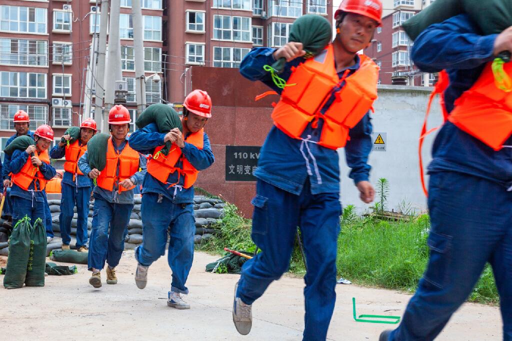 本次演練場景設(shè)置為滑縣遭受短時(shí)強(qiáng)降雨天氣,并伴有6到7級大風(fēng),降水量100-150mm,滑縣供電公司啟動防汛三級預(yù)警。110千伏變文明變電站電纜溝積水嚴(yán)重,站外雨水倒灌危機(jī)站內(nèi)設(shè)備安全運(yùn)行。該公司防汛應(yīng)急指揮中心立即下令,組織人員趕赴變電站現(xiàn)場,加固防汛擋板,擺放水袋水泵進(jìn)行電纜溝抽水,增加防汛沙袋快速封堵大門等工作有條不紊開展。在經(jīng)過快速的“防外、疏內(nèi)”后,變電站轉(zhuǎn)危為安,水位下降到正常水平。演練圓滿結(jié)束。