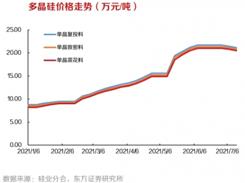 或許是在大擴產的預期下,近期硅料普遍價格由大漲轉向松動。根據硅業(yè)分會數據,上周國內單晶復投料成交均價下滑至 20.81 萬元/噸,周環(huán)比降幅為 1.61%;單晶致密料成交均價下滑至 20.6 萬元/噸,周環(huán)比降幅為 1.06%;單晶菜花料成交均價下滑至 20.35 萬元/噸,周環(huán)比降幅 0.73%。