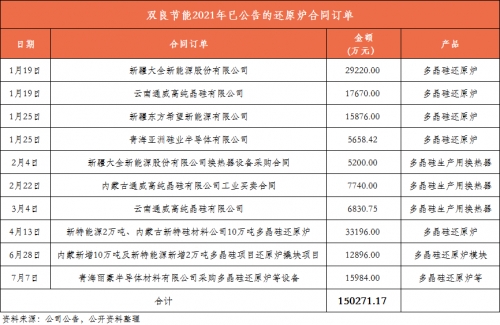 與此同時,國內多晶硅還原爐市占率第一、該細分領域絕對龍頭的雙良節(jié)能也受益頗豐(還原爐是生產多晶硅的重要設備),近三年來累計為行業(yè)各家硅料企業(yè)提供三百多臺大型高效還原爐。據公告統(tǒng)計,2021年以來公司已簽訂的多晶硅還原爐項目已高達15.02億元,相比2020全年多晶硅還原爐系統(tǒng)實現(xiàn)的1.77億元收入,大幅增長748.59%。