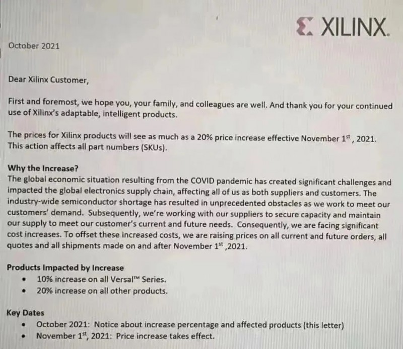 9月底,多家主要海外芯片生產(chǎn)商紛紛宣布,對IGBT和IC半導(dǎo)體等核心芯片展開新一輪漲價。意法半導(dǎo)體表示,將在今年最后一個季度提高所有產(chǎn)品價格,包括現(xiàn)有庫存;安森美則是從10月初開始,對部分產(chǎn)品漲價生效,新價格將適用于新訂單和現(xiàn)有積壓訂單;此外,賽靈思也發(fā)布通知稱,將會提高2021年11月1日及之后所有當前和未來的訂單、所有報價和所有發(fā)貨的價格。