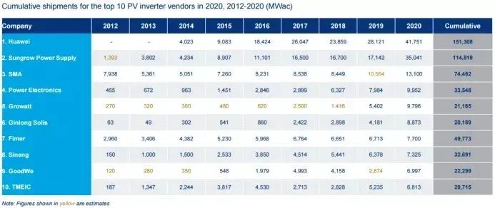 (2012-2020年全球前十逆變器供應(yīng)商的出貨數(shù)據(jù)統(tǒng)計。來源:伍德麥肯茲)