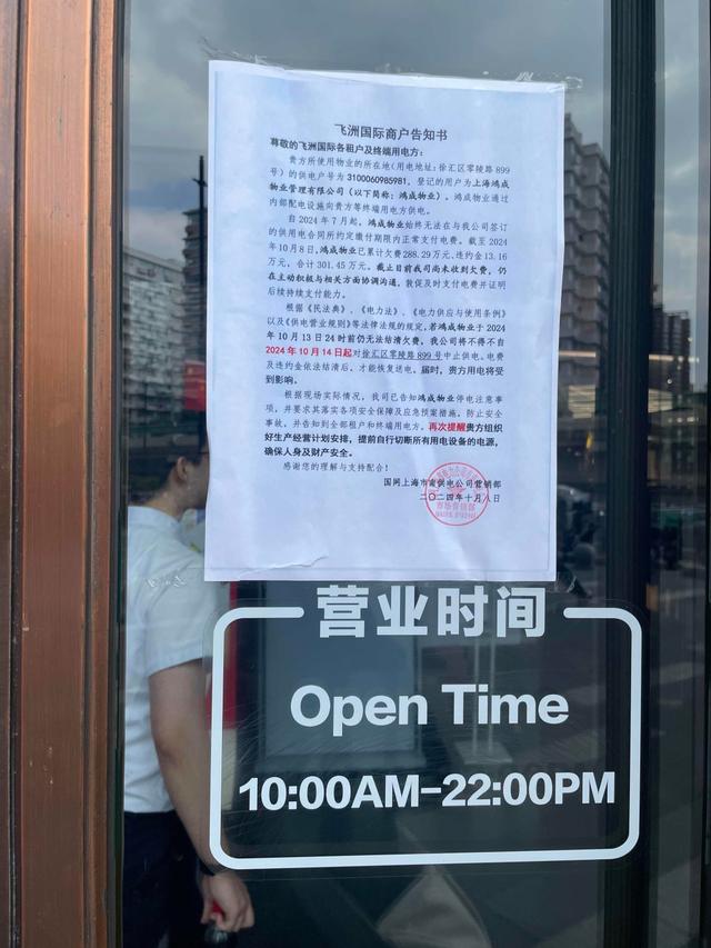 不過,在該商場門口、電梯口等多處地方都貼上了告示,上面寫著:自2024年7月起,鴻成物業(yè)無法在供電合同所約定繳付期限內(nèi)正常支付電費。截至2024年10月8日,鴻成物業(yè)已累計欠費288.29萬元、違約金13.16萬元,合計301.45萬元。若鴻成物業(yè)于2024年10月13日24時前仍無法結(jié)清欠費,國網(wǎng)上海市南供電公司不得不自2024年10月14日起,對零陵路899號中止供電。