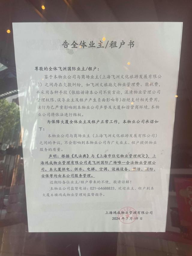 值得注意的是,鴻成物業(yè)與飛洲文旅此前已經(jīng)存在經(jīng)濟糾紛。記者辦公樓下看到,鴻成物業(yè)7月19日發(fā)布了一份“告全體業(yè)主/租戶書”,上面寫著,鴻成物業(yè)與飛洲文旅之間存在欠款糾紛,如飛洲文旅拖欠物業(yè)費、能耗費,并拒絕支付相關(guān)費用,鴻成物業(yè)將進行依法維權(quán)。