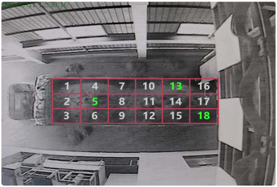 通過攝像頭的實時畫面,基于深度學習物體檢測車輛,捕捉貨車車廂上頂蓋平面,用線條等分,繪制18個子采樣區(qū)域,并對子區(qū)域進行編號,直觀展示采樣分布。