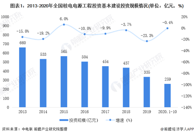 受到福島核電站等事故的影響,我國核電建設(shè)雖然處在高速發(fā)展期,但是保持著以“穩(wěn)”為主的基調(diào),新開工機(jī)組數(shù)量較少,核電工程投資額有所下滑。根據(jù)中國電力企業(yè)聯(lián)合會的統(tǒng)計(jì)數(shù)據(jù)顯示,2020年1-10月,全國主要核電企業(yè)電源工程完成投資259億元,同比下降0.4%。