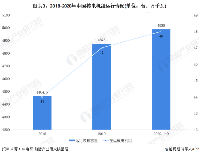 截至2019年底,中國在運(yùn)核電機(jī)組共47臺,分別位于8個(gè)沿海省份的13個(gè)核電基地中,運(yùn)行裝機(jī)容量達(dá)到4875萬千瓦,位居世界第三,占全國總裝機(jī)容量的2.5%左右。截止2020年9月底,中國在運(yùn)核電機(jī)組48臺,總裝機(jī)容量4988萬千瓦。
