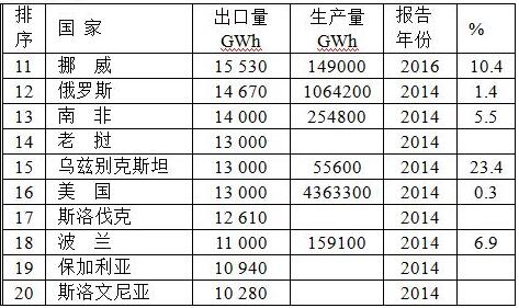 現(xiàn)在又看全球電力出口情況。表中%表示電力輸出量占該國(guó)生產(chǎn)量的份額。出口國(guó)約有95個(gè)國(guó)家或地區(qū),請(qǐng)點(diǎn)擊美國(guó)中央情報(bào)局網(wǎng)站:https://www.cia.gov/library/publications/the-world-factbook/rankorder/2234rank.html