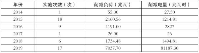 在需求響應(yīng)實(shí)施早期,實(shí)施目的主要是為了應(yīng)對(duì)夏季高峰時(shí)段電力消費(fèi)緊張狀況,最大程度削減高峰電力負(fù)荷對(duì)電網(wǎng)安全的影響,保障了民生用電和重點(diǎn)用電安全平穩(wěn)。2014~2019年度國(guó)內(nèi)開展削峰需求響應(yīng)的情況如下表所示。